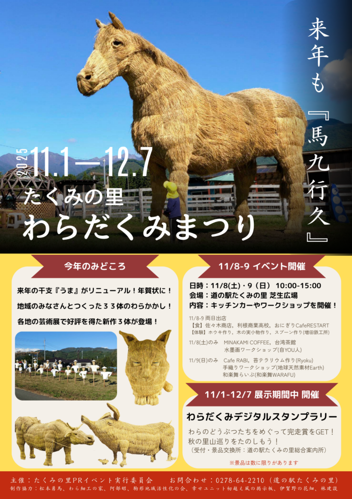 今年も11月からわらのどうぶつたちや、地元のこどもたち、観光客の皆様と作った案山子(かかし)が、紅葉に染まる美しい里山風景ととともに皆様をお迎えいたします!来年の干支【馬】をはじめ、
