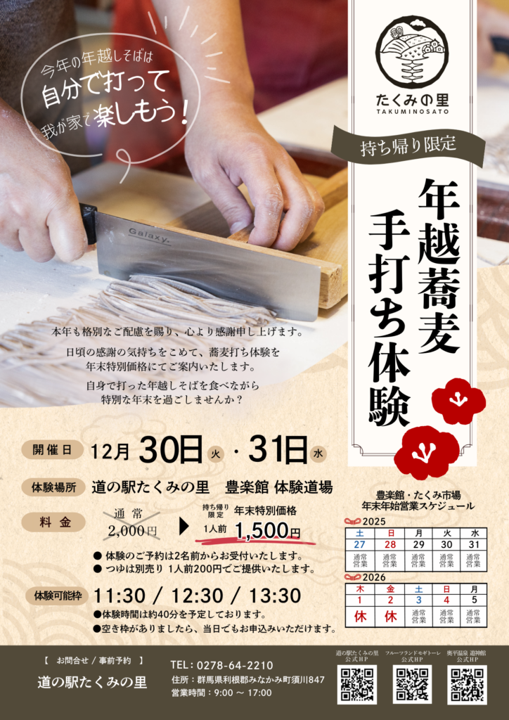 自分で打ったお蕎麦を持ち帰り、年越しを迎えてみませんか。